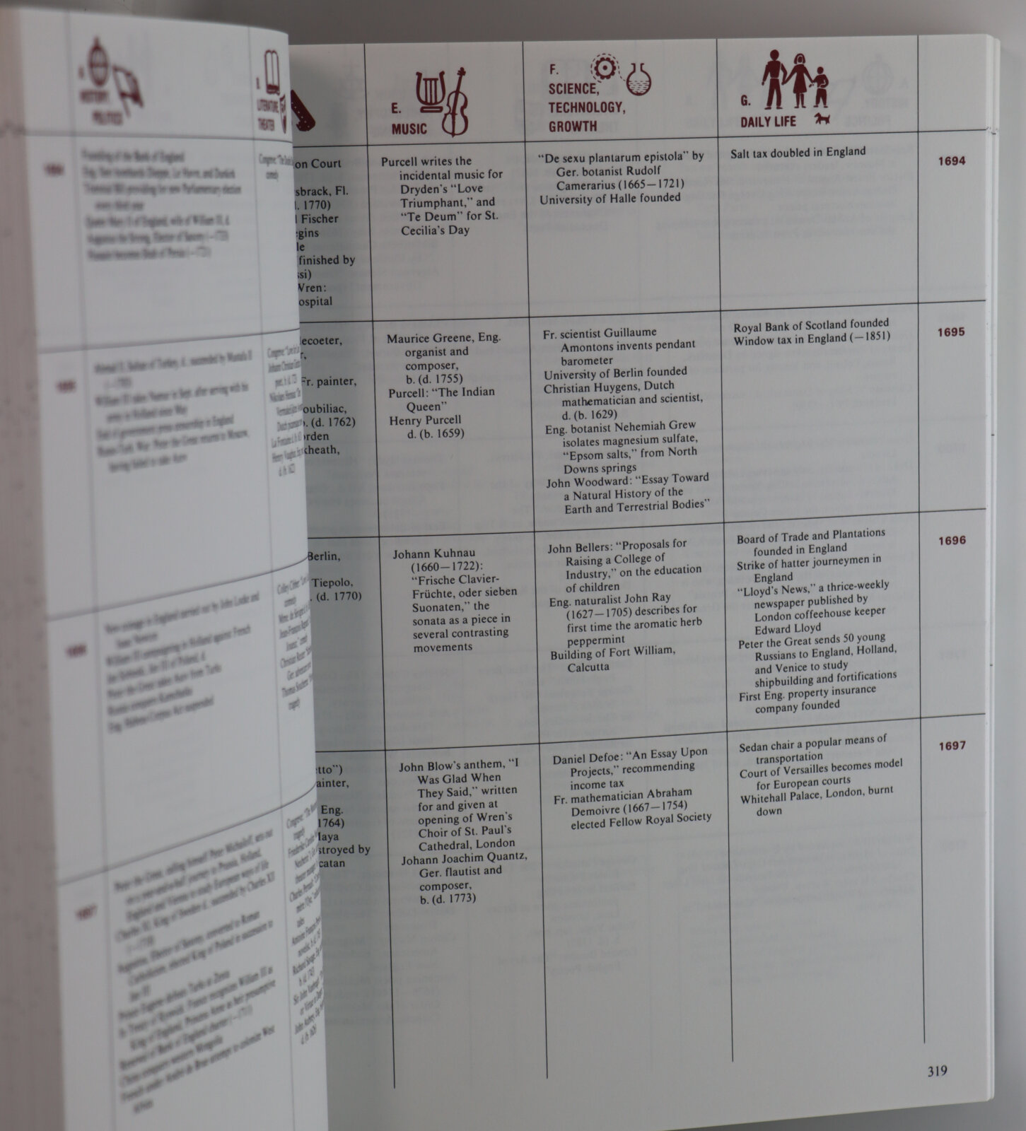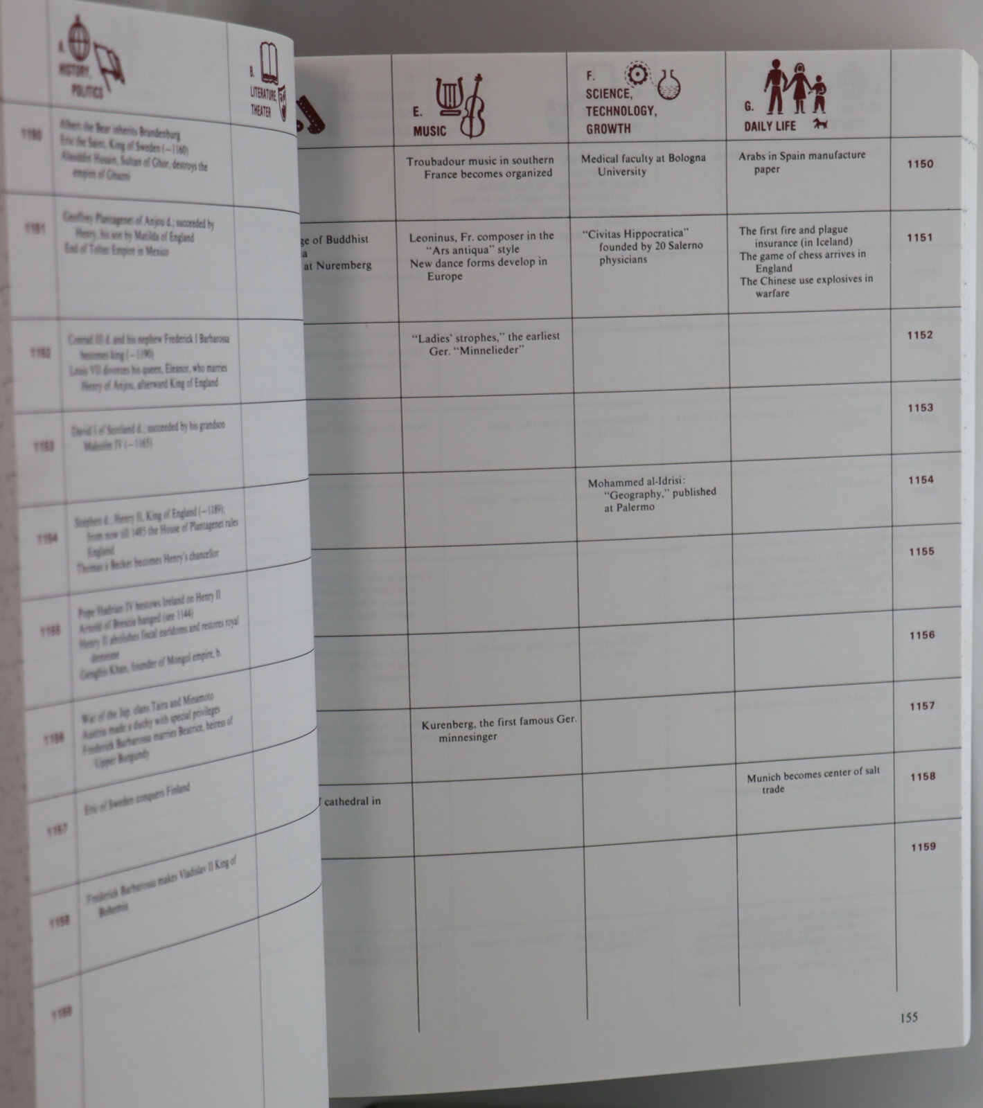 The TimeTables of History goes one better than the early chronicles, in that it lays things out across the double page spread in columns of politics, art, science, etc, making it at least easier to find something if you know the approximate date and what kind of thing it was.