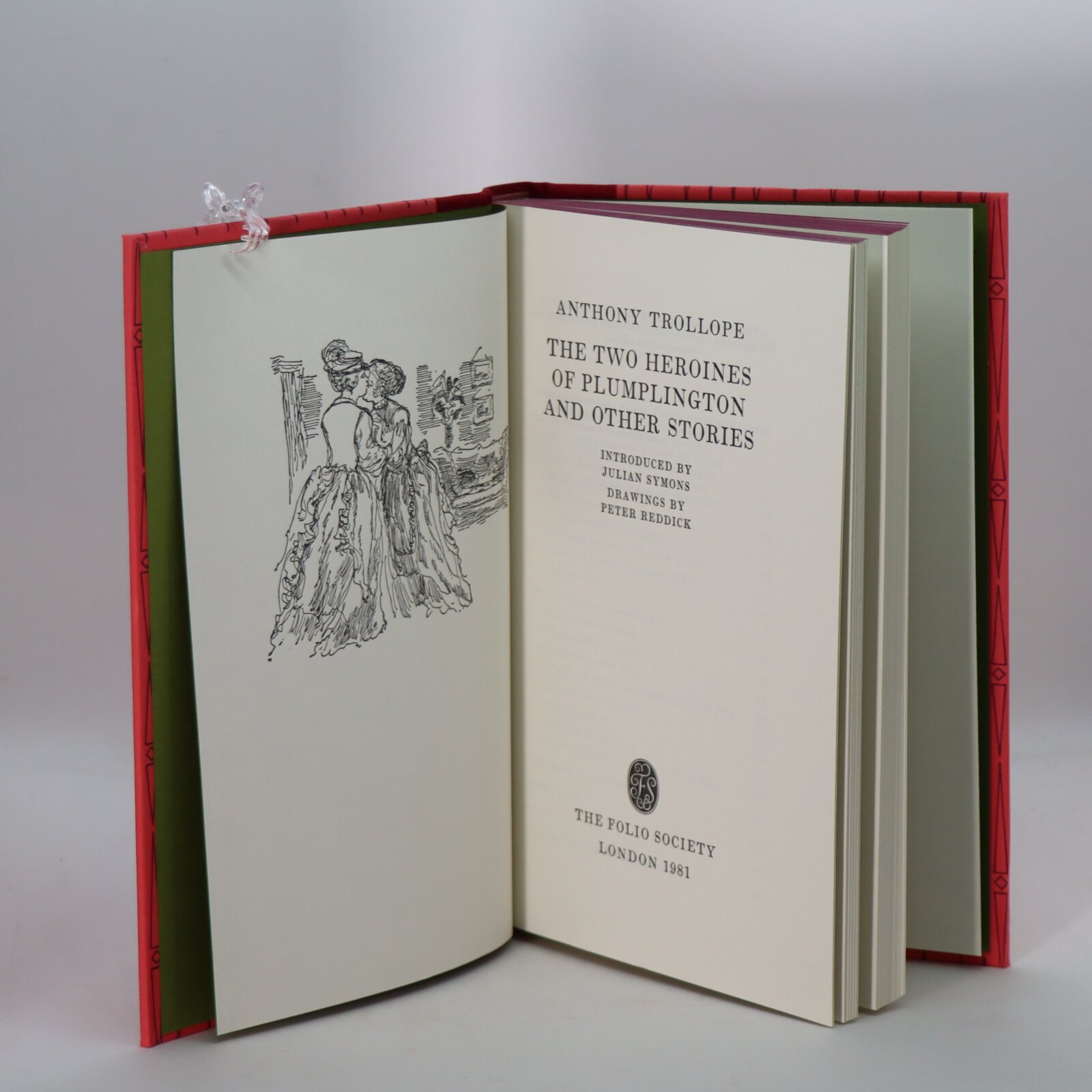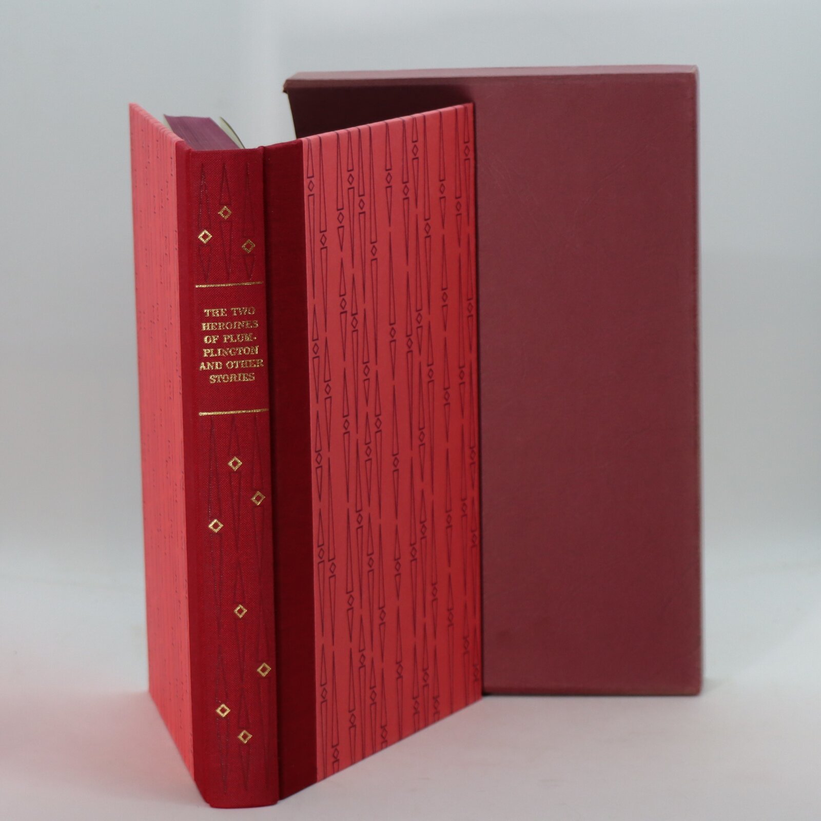 In a fitted box. Red cloth spine with gilt title. Pink geometric design paper boards.