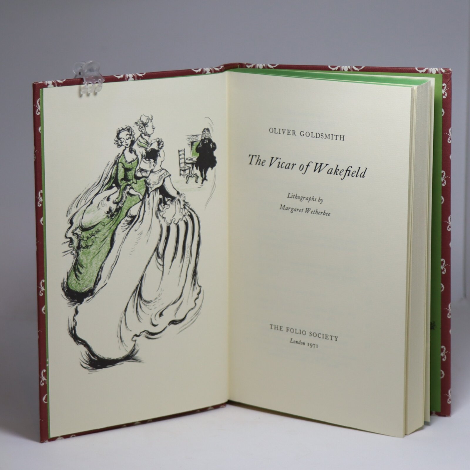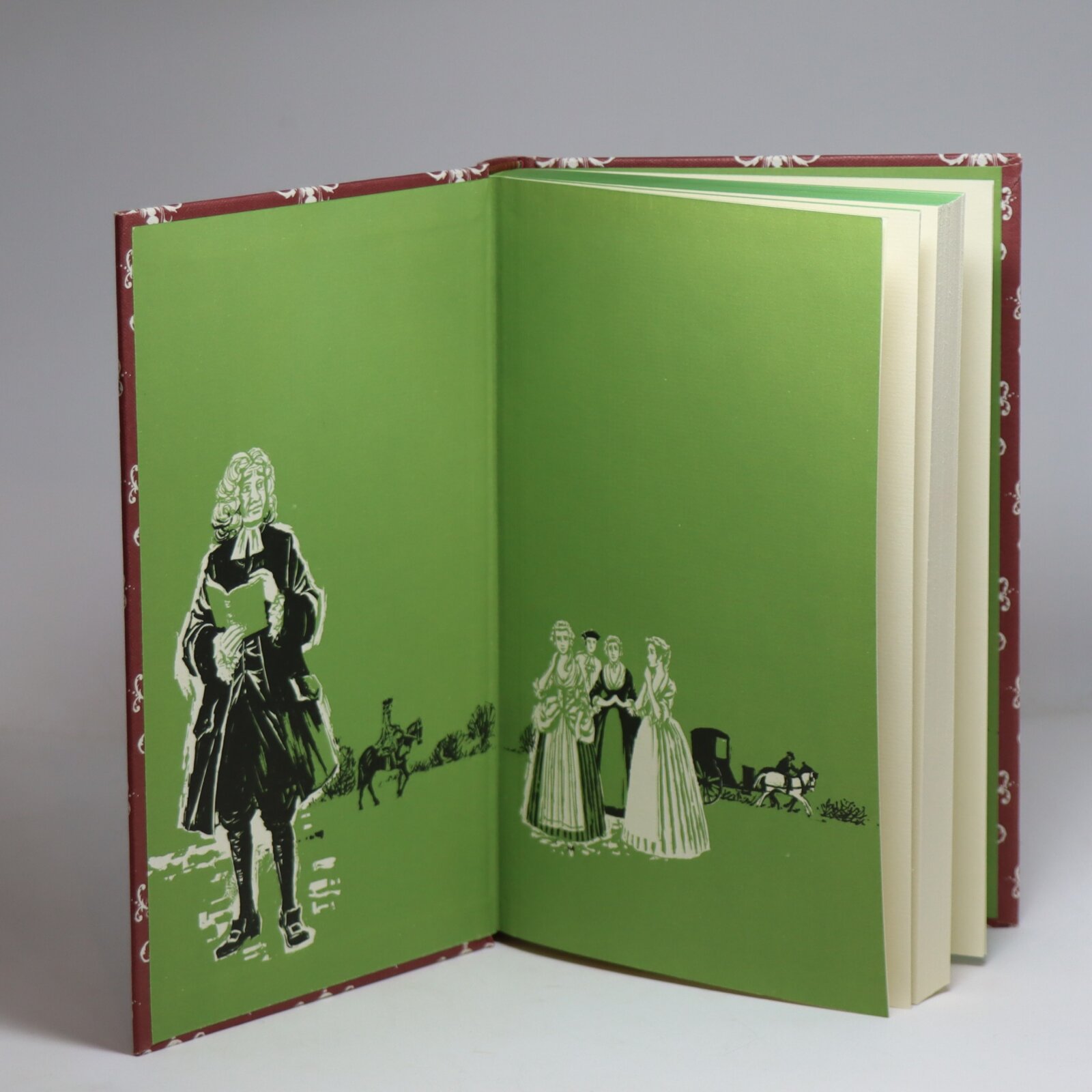 In a fitted box. Mauve coth with allover white emblem design. Green title plate with gilt title on the spine.