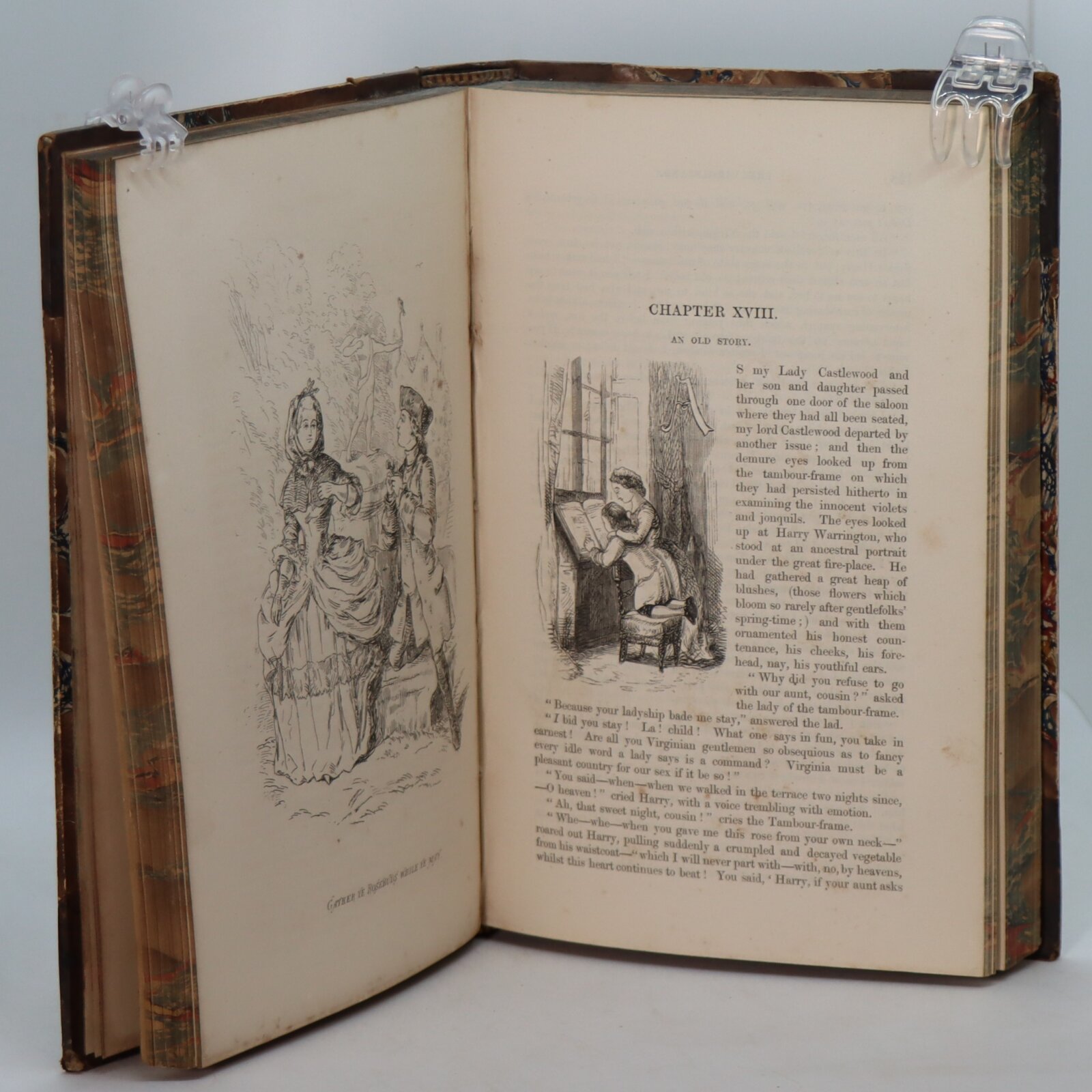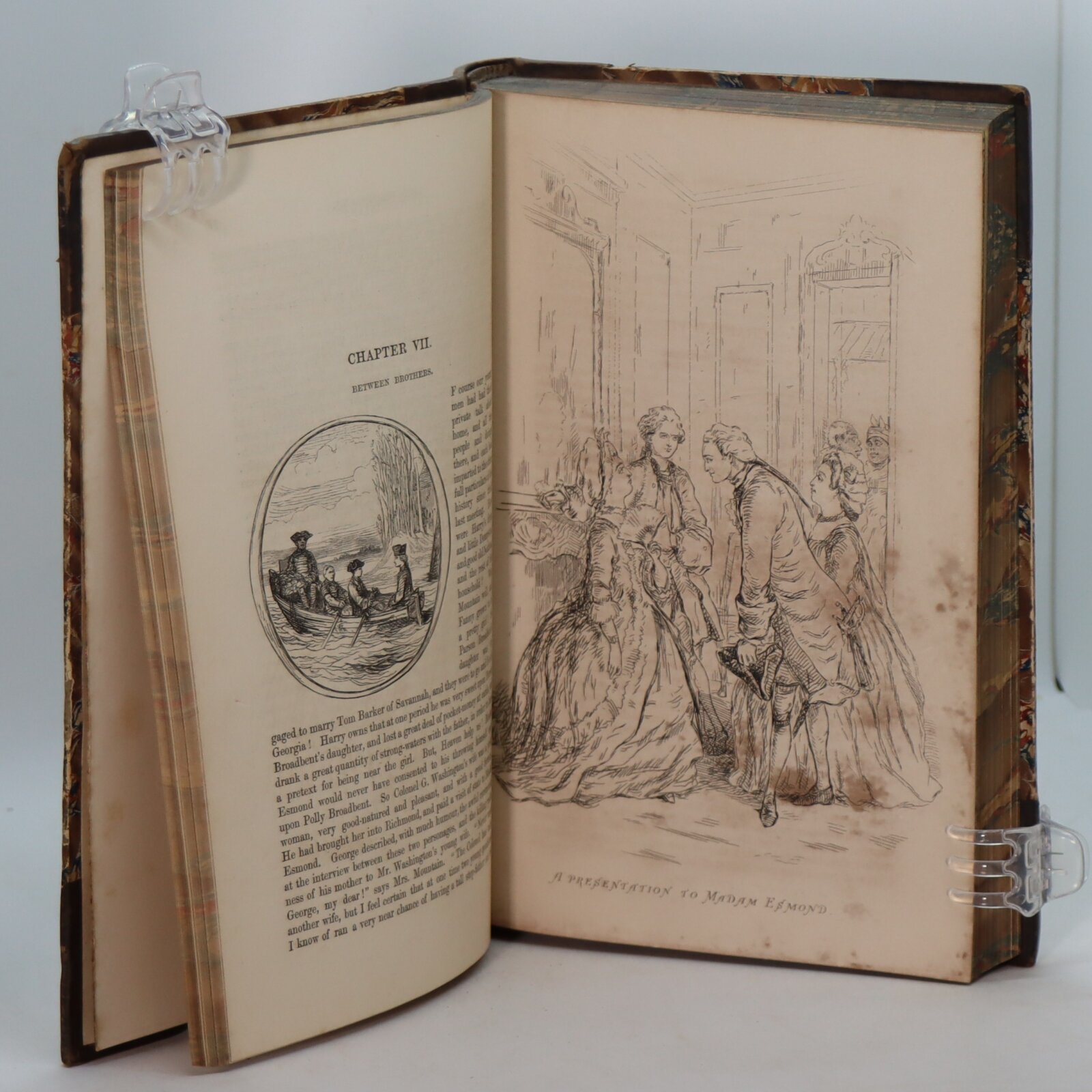 In 1852, The History of Henry Esmond was published as a 3-volume novel without first being serialized and with special type meant to imitate the appearance of an eighteenth-century book. This was the most carefully planned of Thackeray’s novels, and for it he did a considerable amount of historical research. The book was celebrated for its brilliance, and Thackeray recognized it as “the very best I can do. . . my card” (Monsarrat 285), despite the “cutthroat melancholy” he felt it was infused with. At the time, it caused a sensation thanks to its controversial ending, wherein the hero marries a woman who early in the novel seemed a “mother” to him.