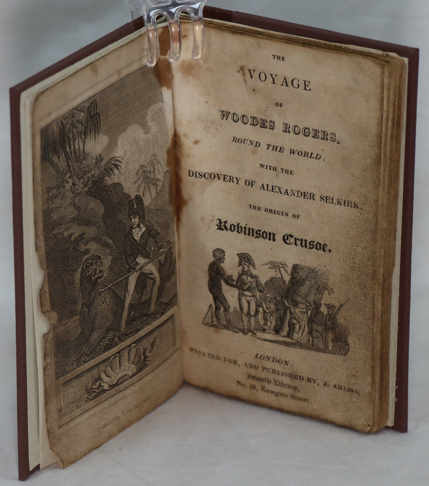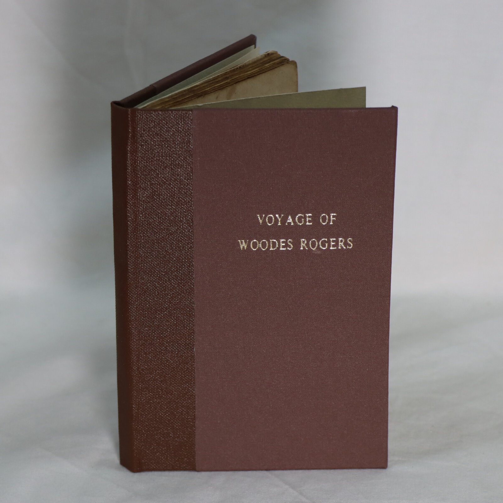This chapbook has been beautifully rebound by Mr. Brian Cole relates the story of Woodes Rogers (c. 1679 – 15 July 1732) who was an English sea captain, privateer, slave trader and, from 1718, the first Royal Governor of the Bahamas. He is known as the captain of the vessel that rescued marooned Alexander Selkirk, whose plight is generally believed to have inspired Daniel Defoe’s Robinson Crusoe.