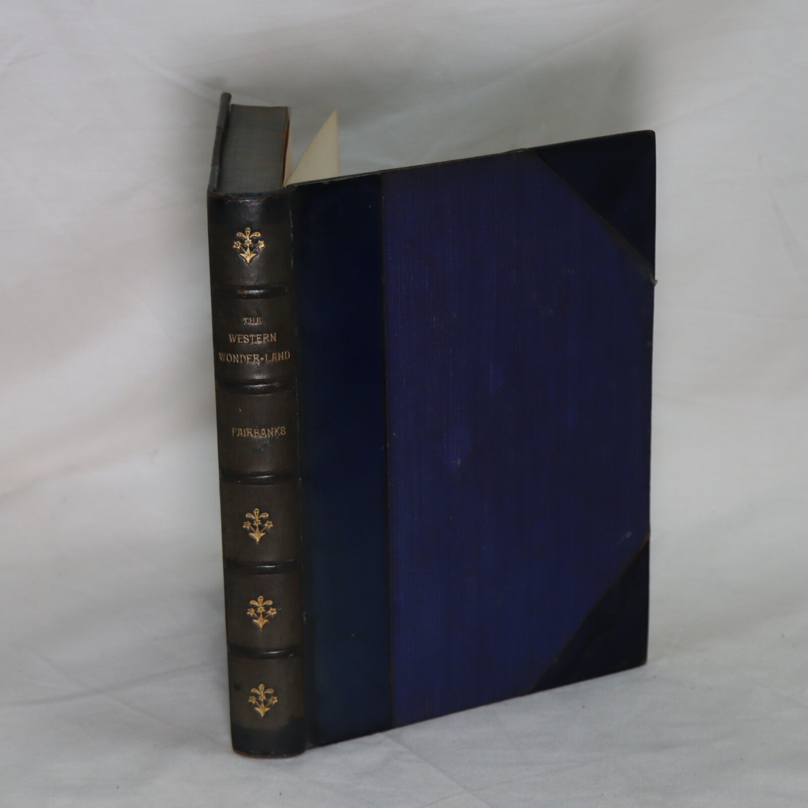 Navy calf spine with raised banding, gilt title and decoration. Navy cloth boards.
