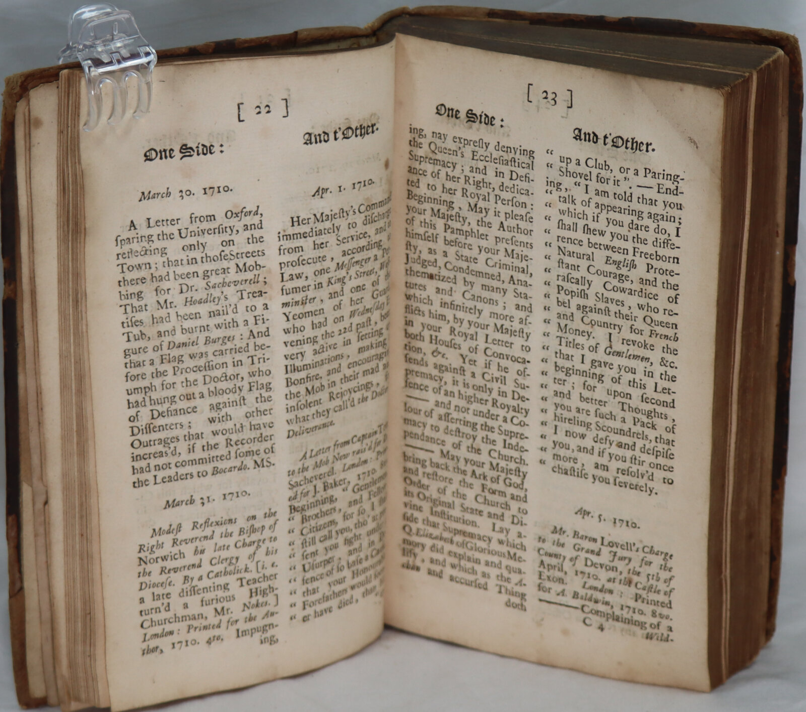 The Wisdom of looking Backward, to judge the better of one Side and t’Other by the Speeches, Writings, Actions, and other Matters of Fact on both Sides, for the four Years last past. London, J. Roberts, 1715. A fine copy. First edition, an intriguing retrospective of political (and religious) infighting, anatomizing the pamphlet controversies of the last years of Queen Anne’s reign. The work is printed in two columns, ‘One Side’, ‘And t’Other’, and includes numerous extracts from printed works, as well as private letters, gossip and newspaper columns; despite the apparently even-handed format, the reader is invited to conclude that ‘the One Side [the Tories] … were Agents or Tools in supplanting a good Ministry, abusing a good Queen, and inflaming a rash Clergy’, while ‘t’Other’ side, the Whigs, were ‘for the most Part, a good old Sort of Sober Sensible Men, who were all along for the Honour of the Monarchy, the Peace of the Church, and the true Interest of their Countrey’. Swift makes several appearances, with mention of his Miscellanies (1711), and extracts from A Proposal for correcting, improving, and ascertaining the English Tongue (1712).