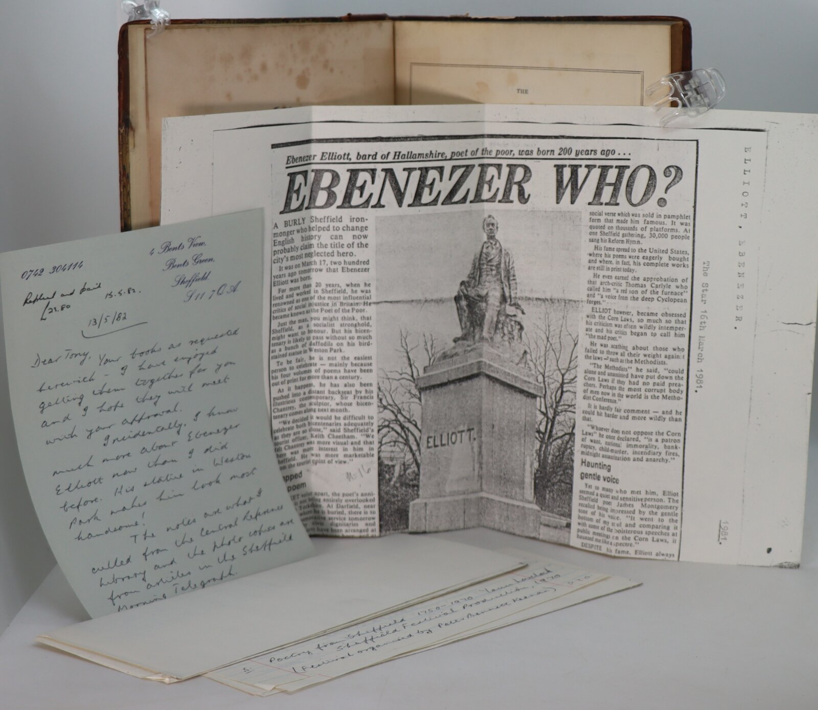 Very scarce early work containing much ephemera relating to this great man Ebenezer Elliott (17 March 1781 – 1 December 1849) was an English poet, known as the Corn Law rhymer for his leading the fight to repeal the Corn Laws, which were causing hardship and starvation among the poor. Though a factory owner himself, his single-minded devotion to the welfare of the labouring classes won him a sympathetic reputation long after his poetry ceased to be read. Elliott’s poems often seem naive or archaic to the modern reader who gets the impression that Elliott is struggling to write verse – the more he wrestles, the worse he becomes! In a fragment of autobiography printed in The Athenaeum (12 January 1850)