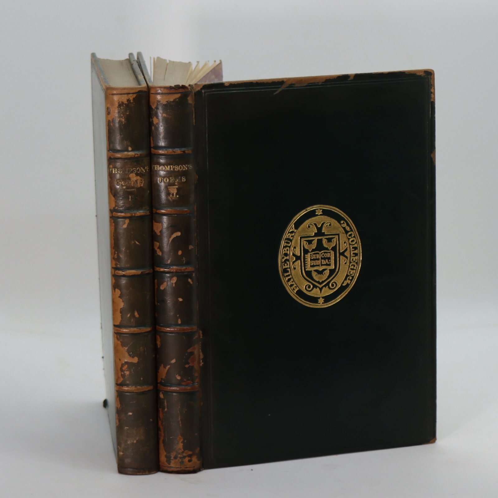 Full green leather with gilt Hailbury College on the front boards. Raised banding with gilt title on the spine. Dimensions are for one volume.
