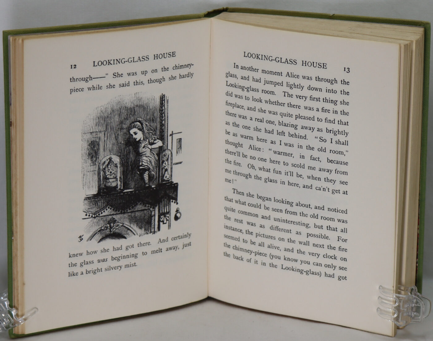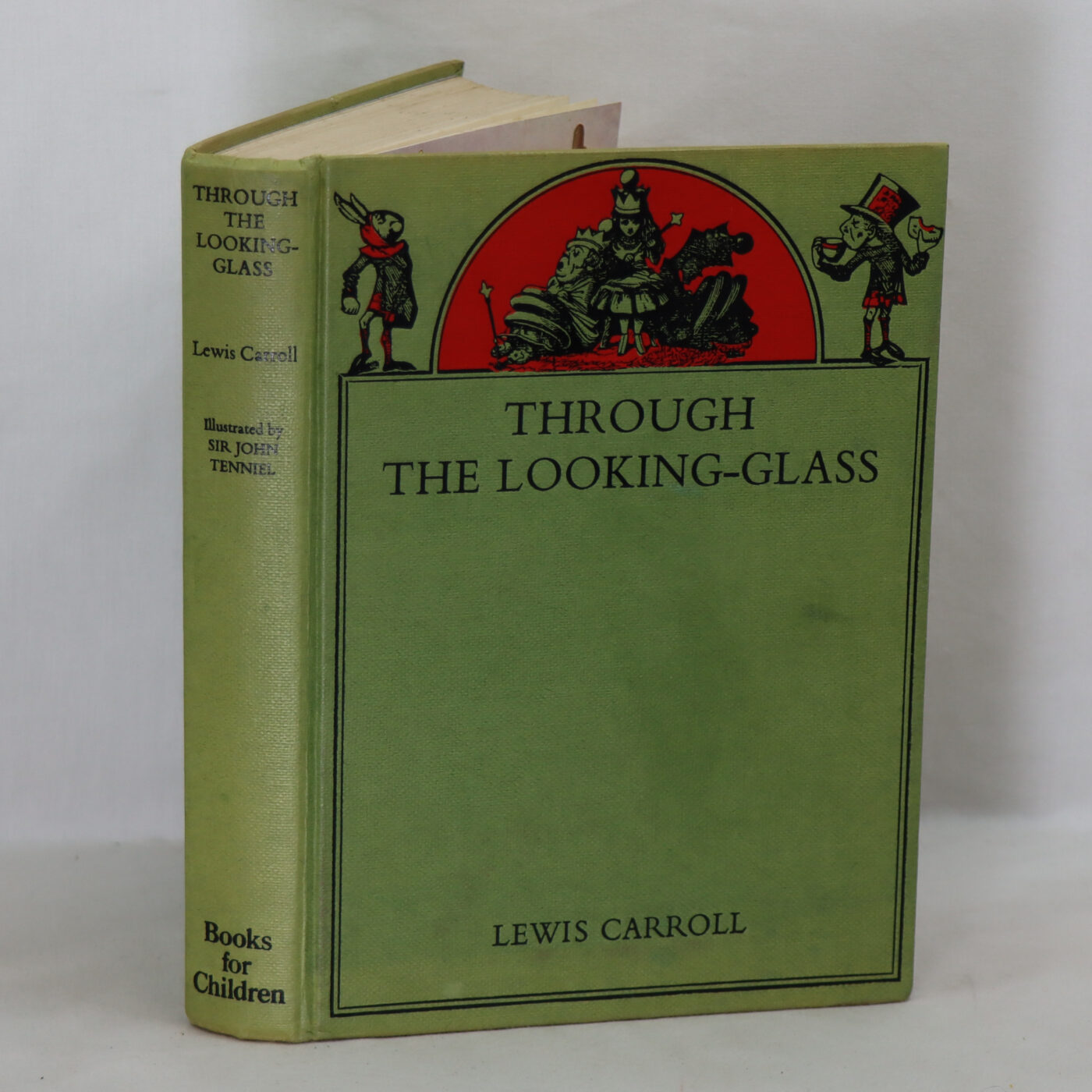 Through the Looking-Glass, and What Alice Found There is a novel published in December 1871 by Lewis Carroll, the pen name of Charles Lutwidge Dodgson, a mathematics lecturer at Christ Church, Oxford. It is the sequel to his Alice’s Adventures in Wonderland (1865), in which many of the characters were anthropomorphic playing cards. In this second novel the theme is chess. As in the earlier book, the central figure, Alice, enters a fantastical world, this time by climbing through a large looking-glass (a mirror) into a world that she can see beyond it. There she finds that, just as in a reflection, things are reversed, including logic (for example, running helps one remain stationary, walking away from something brings one towards it, chessmen are alive and nursery-rhyme characters are real).