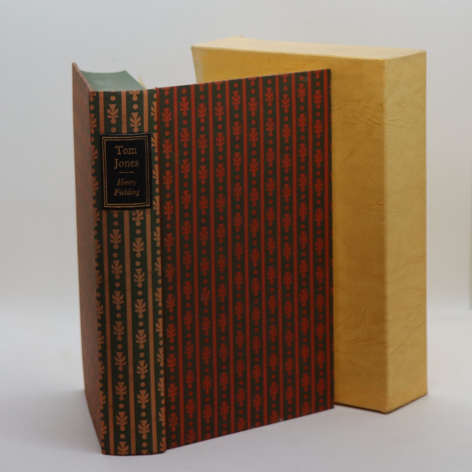 In a fitted box. Green and red stiped patterned binding. Black title plate with gilt lettering on the spine.