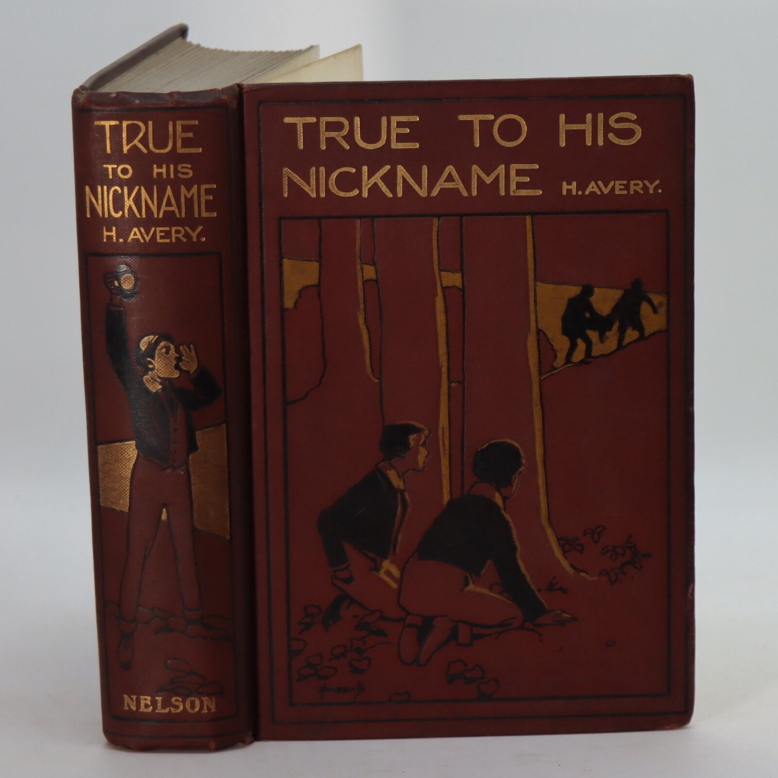 Brown cloth binding with gilt title and boys image on front board and similar on the spine.