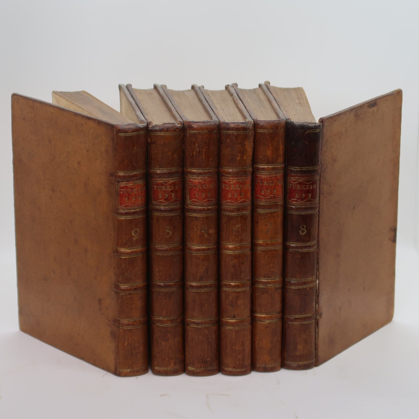 Full tan leather binding with red title plate, gilt banding and lettering on the spine.