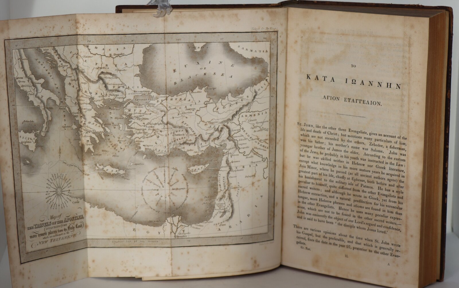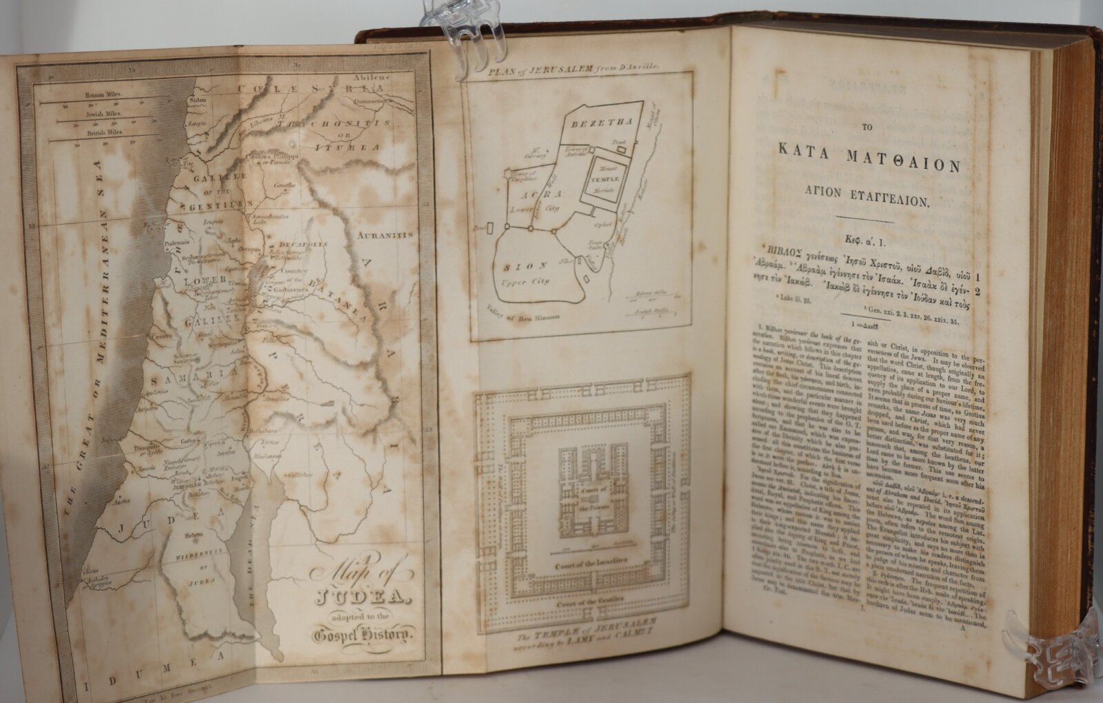 Brown leather binding with red title plates, gilt banding, decoration and title on the spine. Gilt line edging on the boards.