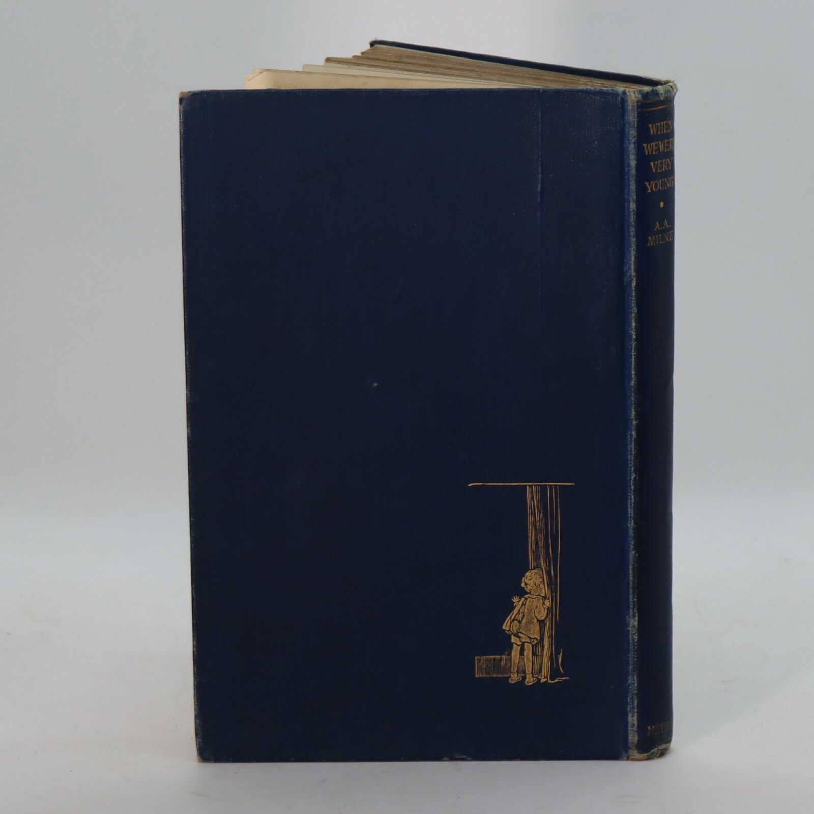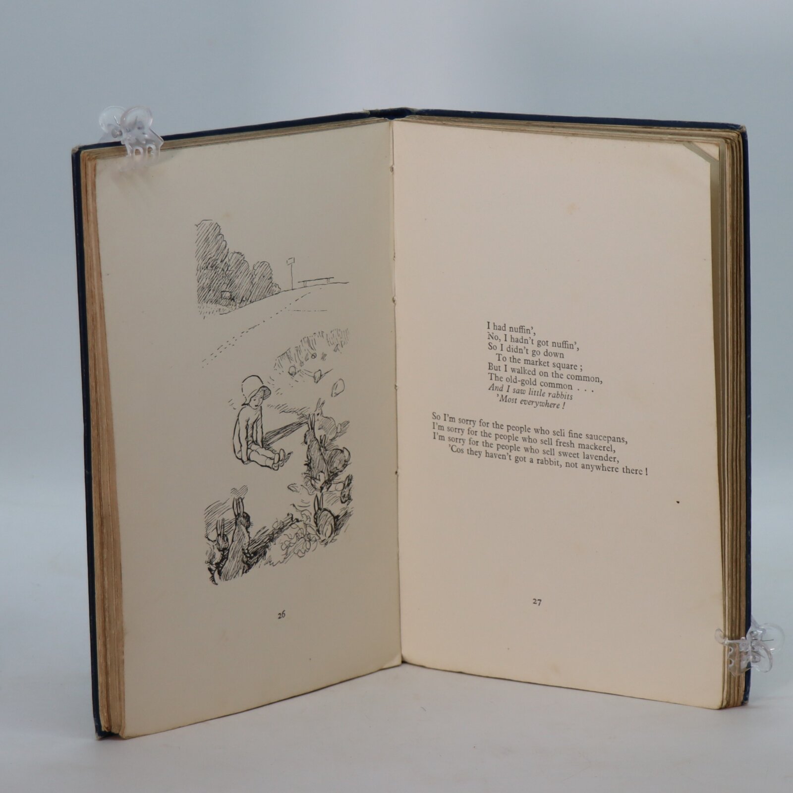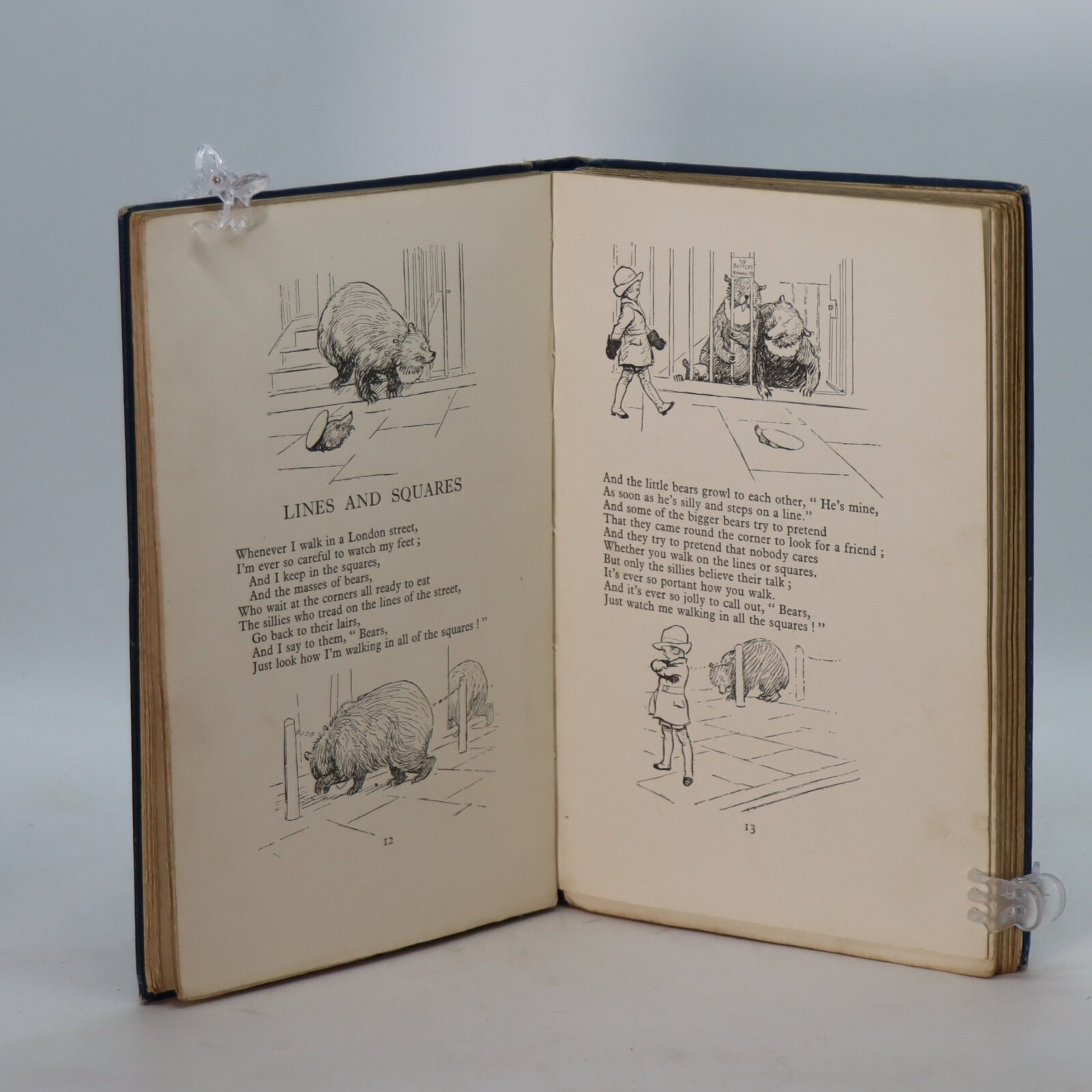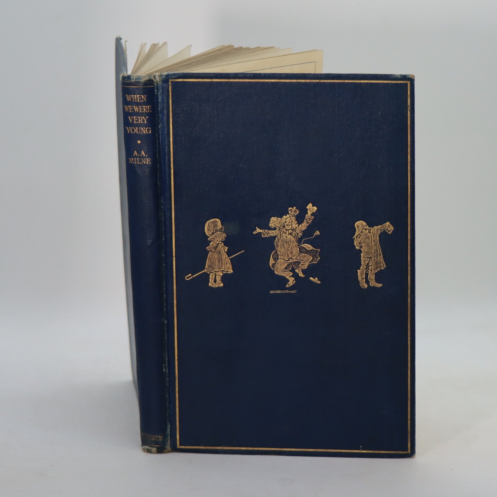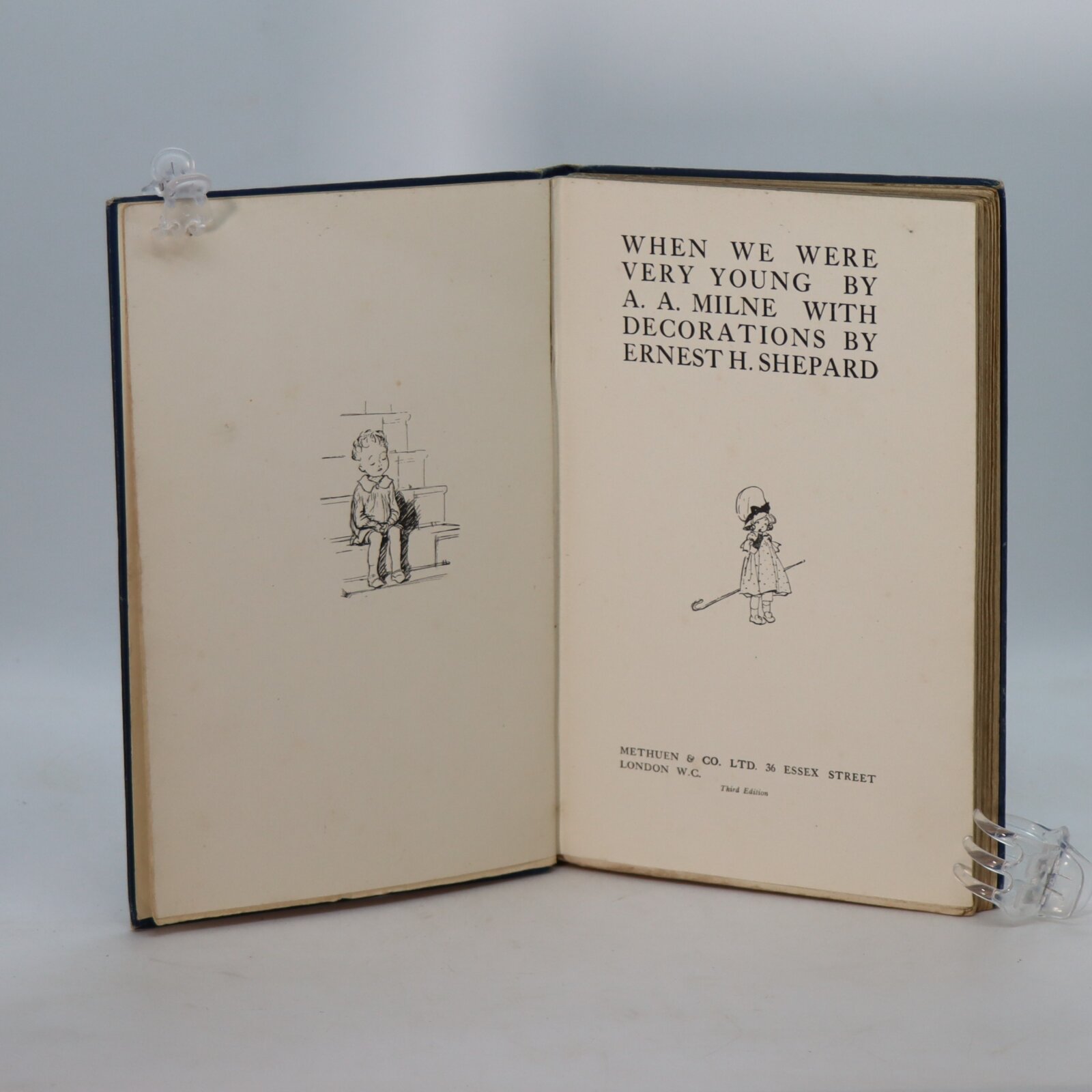 When We Were Very Young is a best-selling book of poetry by A. A. Milne. It was first published in 1924, and was illustrated by E. H. Shepard. Several of the verses were set to music by Harold Fraser-Simson. The book begins with an introduction entitled “Just Before We Begin”, which, in part, tells readers to imagine for themselves who the narrator is, and that it might be Christopher Robin. The 38th poem in the book, “Teddy Bear”, that originally appeared in Punch magazine in February 1924, was the first appearance of the famous character Winnie-the-Pooh, first named “Mr. Edward Bear” by Christopher Robin Milne. In one of the illustrations of “Teddy Bear”, Winnie-the-Pooh is shown wearing a shirt which was later coloured red when reproduced on a recording produced by Stephen Slesinger. This has become his standard appearance in the Disney adaptations. On January 1, 2020, When We Were Very Young became part of the public domain in the United States, but remains protected in other countries, including the UK.