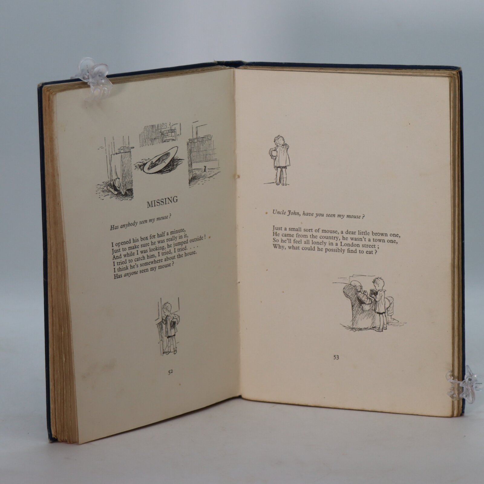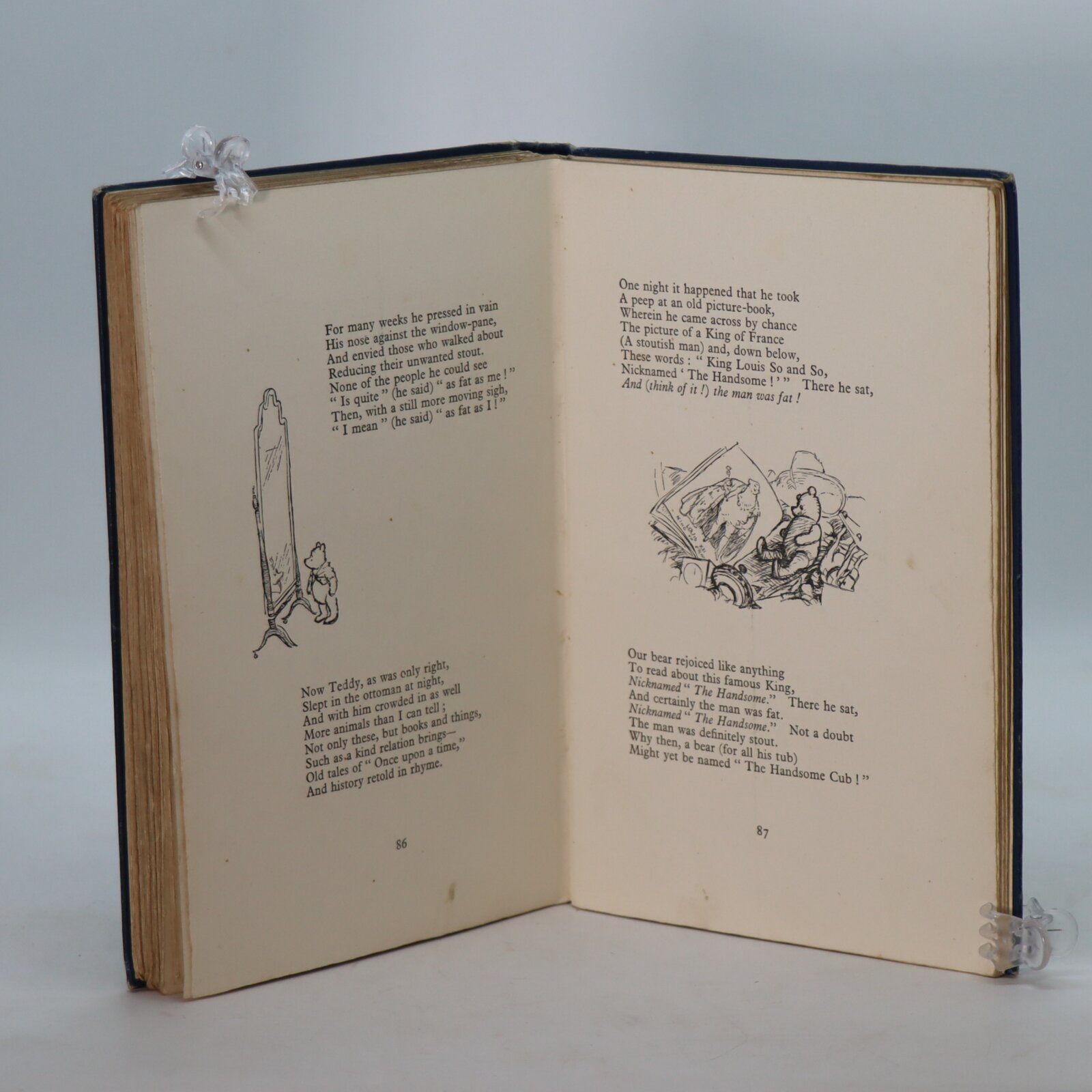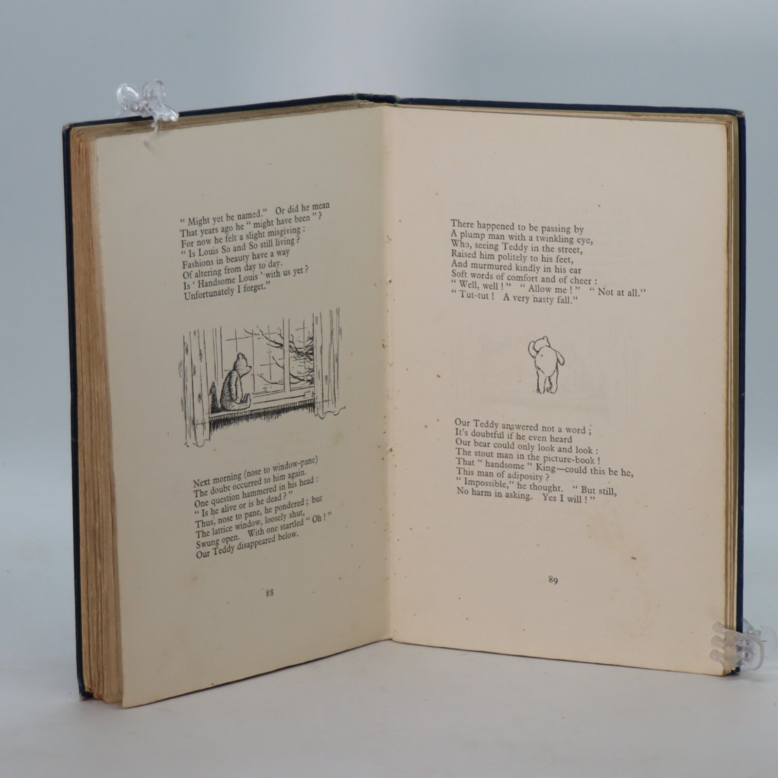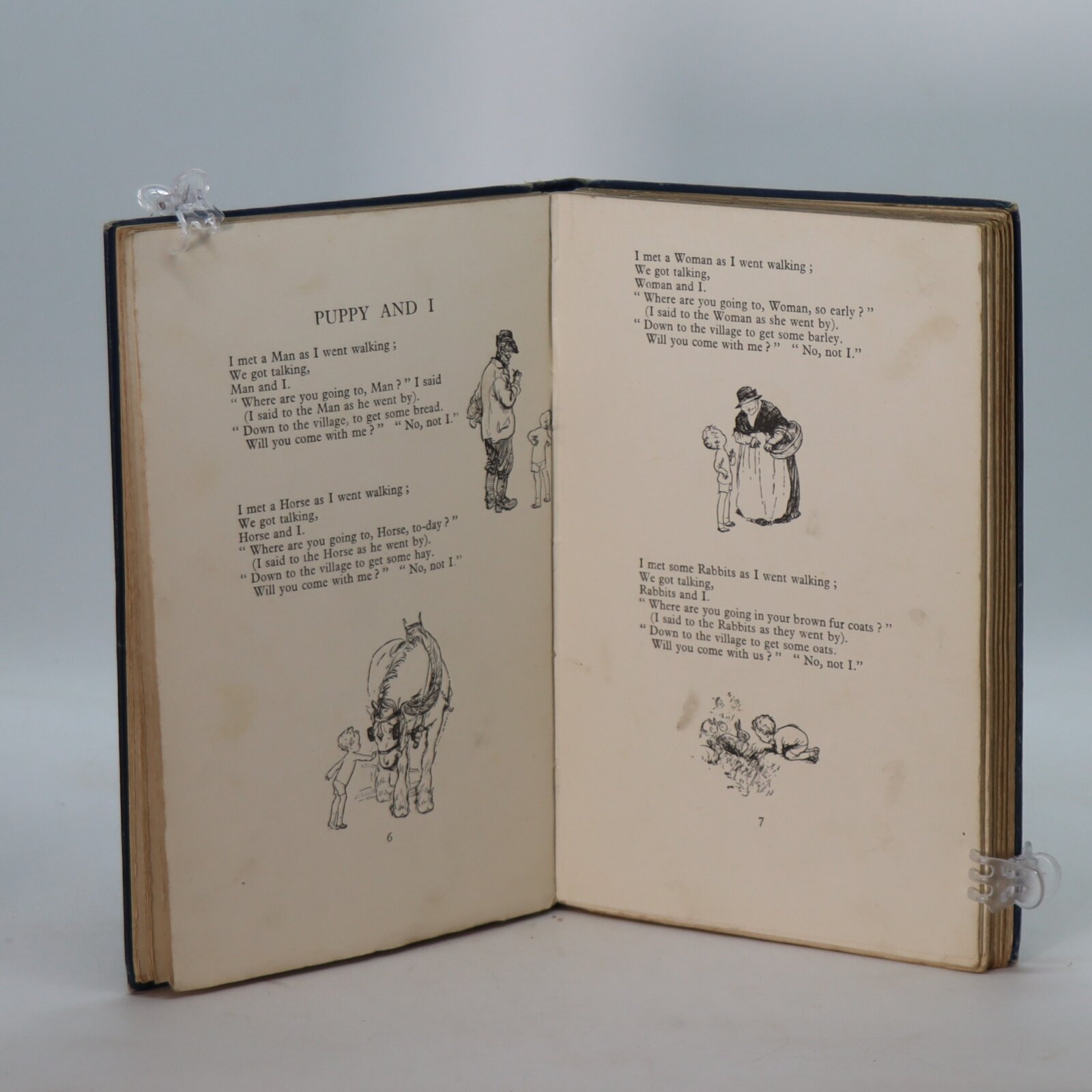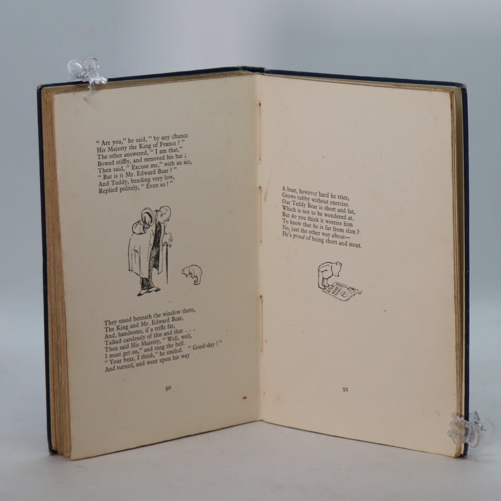 When We Were Very Young is a best-selling book of poetry by A. A. Milne. It was first published in 1924, and was illustrated by E. H. Shepard. Several of the verses were set to music by Harold Fraser-Simson. The book begins with an introduction entitled “Just Before We Begin”, which, in part, tells readers to imagine for themselves who the narrator is, and that it might be Christopher Robin. The 38th poem in the book, “Teddy Bear”, that originally appeared in Punch magazine in February 1924, was the first appearance of the famous character Winnie-the-Pooh, first named “Mr. Edward Bear” by Christopher Robin Milne. In one of the illustrations of “Teddy Bear”, Winnie-the-Pooh is shown wearing a shirt which was later coloured red when reproduced on a recording produced by Stephen Slesinger. This has become his standard appearance in the Disney adaptations. On January 1, 2020, When We Were Very Young became part of the public domain in the United States, but remains protected in other countries, including the UK.
