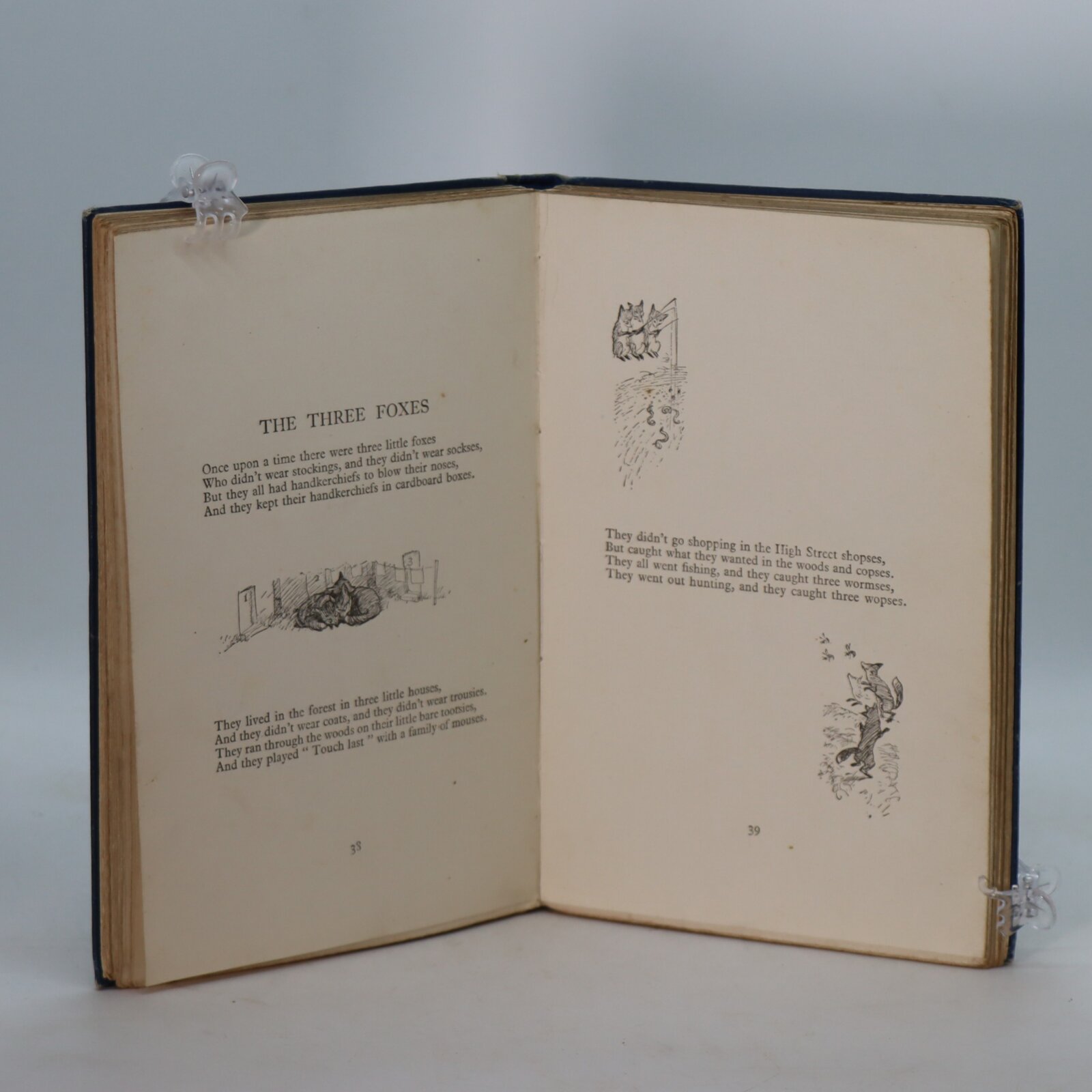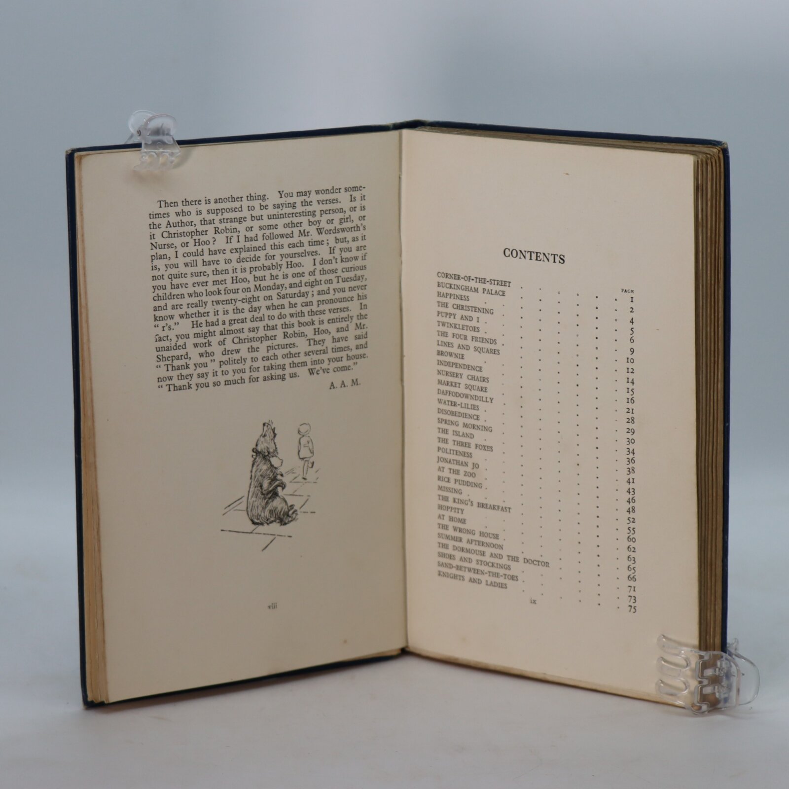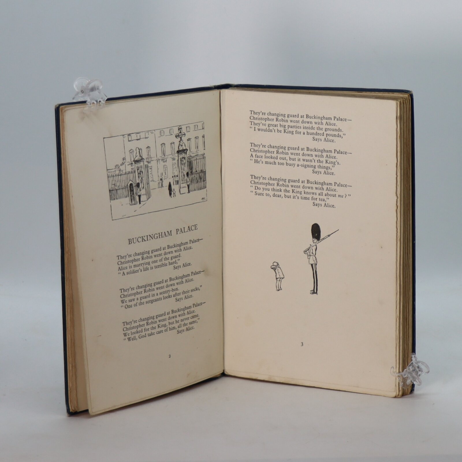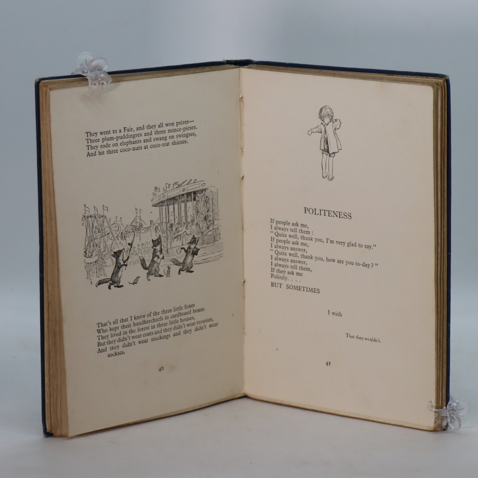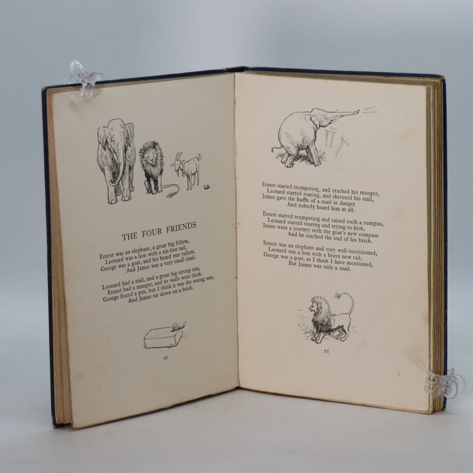 When We Were Very Young is a best-selling book of poetry by A. A. Milne. It was first published in 1924, and was illustrated by E. H. Shepard. Several of the verses were set to music by Harold Fraser-Simson. The book begins with an introduction entitled “Just Before We Begin”, which, in part, tells readers to imagine for themselves who the narrator is, and that it might be Christopher Robin. The 38th poem in the book, “Teddy Bear”, that originally appeared in Punch magazine in February 1924, was the first appearance of the famous character Winnie-the-Pooh, first named “Mr. Edward Bear” by Christopher Robin Milne. In one of the illustrations of “Teddy Bear”, Winnie-the-Pooh is shown wearing a shirt which was later coloured red when reproduced on a recording produced by Stephen Slesinger. This has become his standard appearance in the Disney adaptations. On January 1, 2020, When We Were Very Young became part of the public domain in the United States, but remains protected in other countries, including the UK.