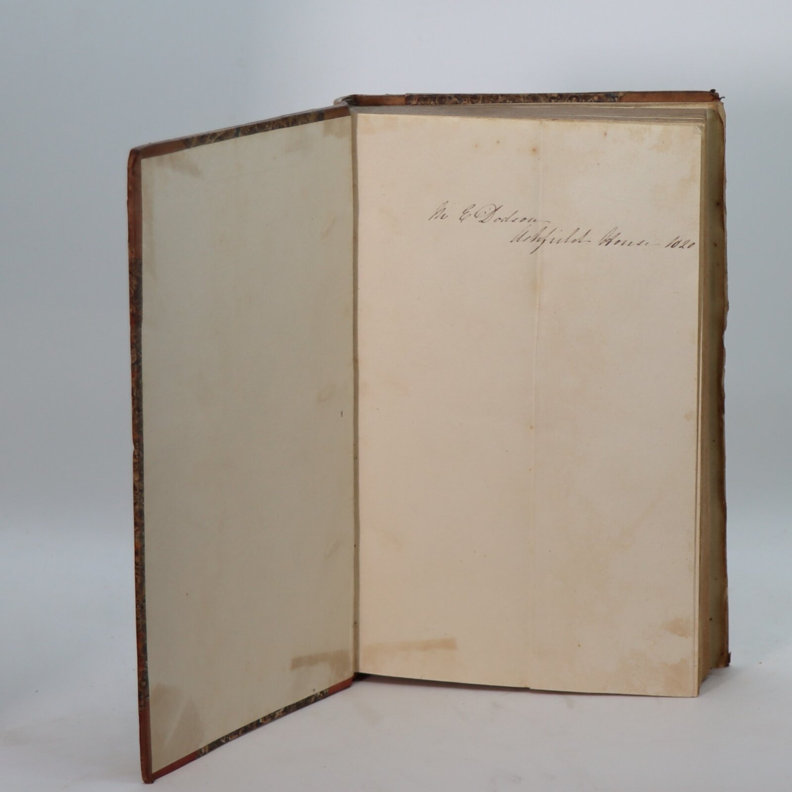 Tan calf spine and corners with green title plate, raised gilt banding and gilt fleur-de-lis on the spine. Brown, tan and red marbled paper boards.
