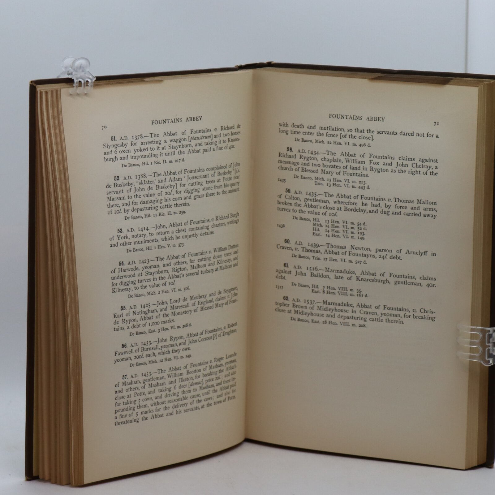Consisting of six books – Monastic Notes Vol. I. : Yorkshire Fines Vols. I, II & IV. : West Riding Session Rolls Vol. III. : West Riding Session Records 1611-1642 Vol. LIV. Brown cloth binding with gilt title and banding on the spine. Dimensions are for one volume, some hinges cracked.